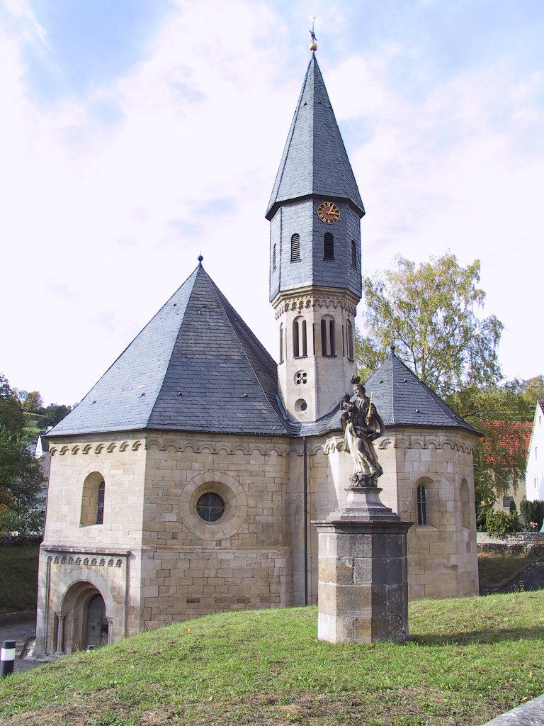 Diese romanische Doppeloktogonkapelle aus dem 12. Jahrhundert wird auch heute noch regelmäßig für katholische Gottesdienste genutzt. Außergewöhnlich für diesen mittelalterlichen Bau aus der Stauferzeit ist die Lage am nahen Grünbachufer. Byzantinischen Einfluss vermutet man bei dem Deckenfresko im kleinen Chorraum, das wohl eines der ältesten in Franken ist.
